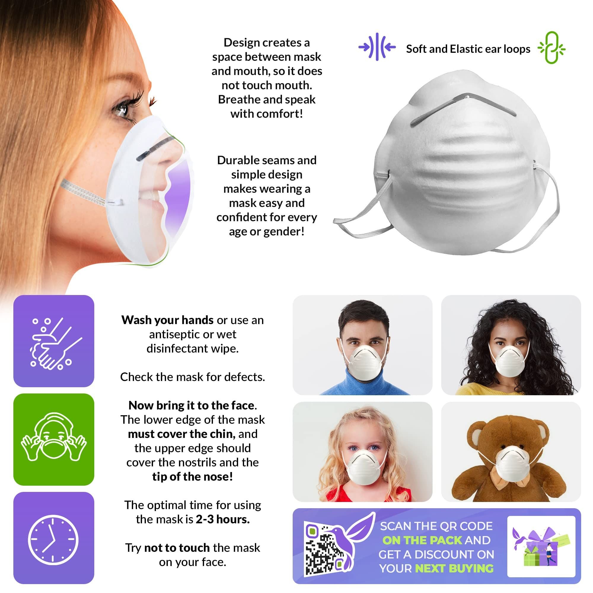 3.Perfect fit. Men's and women's masks are one size that covers your nose and mouth. The full-length aluminum nosepiece helps ensure the perfect fit every time. Our white disposable face masks are suitable for adults, making them ideal to keep at home.