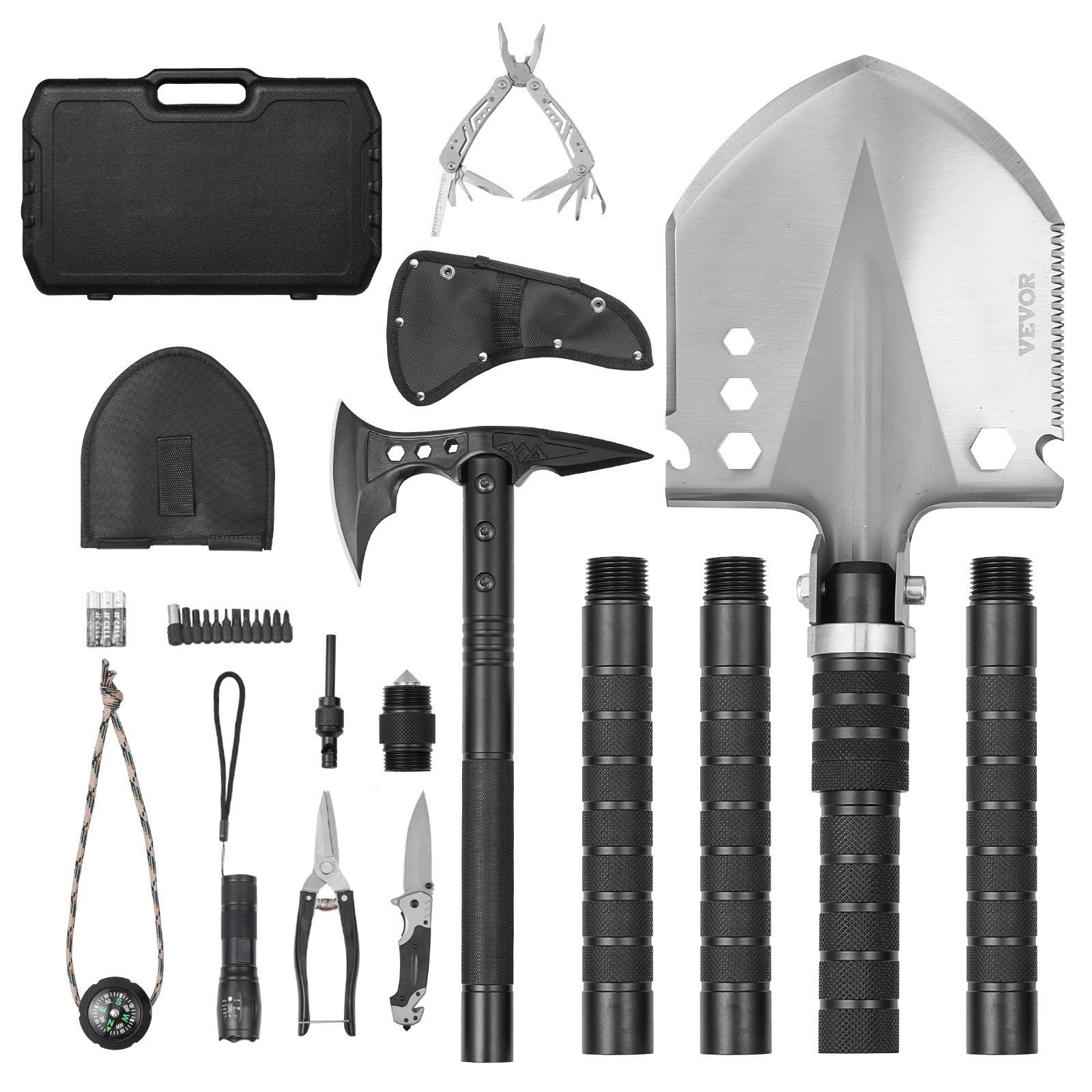 1.Versatile Camping Multitool Kit: This camping kit includes a shovel, axe, knife, compass, whistle, glass breaker, scissors, flashlight, fire starter, and more. Perfect for digging, chopping, fire-starting, cutting, signaling, and bottle-opening-ideal for outdoor survival, camping, hiking, and wilderness adventures.