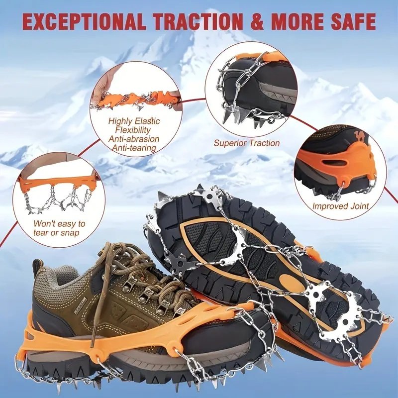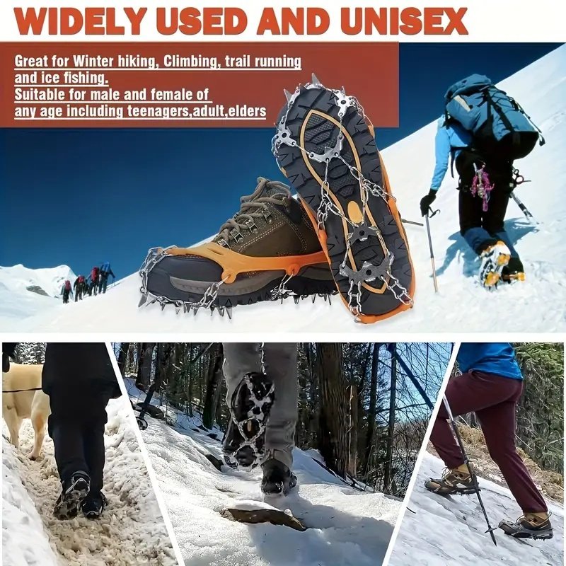 [Widely Used and Unisex] Ice Cleats for Shoes and Boots Suitable for male and female of any age including teenagers,adult,elders. Crampons Ice Cleats Suitable for various kinds of sports,hiking shoes,boots,mountaineering boots. Crampons great for Winter hiking,Climbing, trail running and ice fishing. Ice Cleats used on angled terrain,ice roads,icy driveway,mud and wet grass,dangerous sections of trail,etc.[Exceptional Traction More Safe]Our crampons for boots have 19 steel spikes with welded, double chains on each ice cleat for superior traction. These cleats easily penetrate thick layers of ice and snow, providing outstanding stability and grip to keep you steady and safe on various terrains. Strategic placement of spikes ensures equal distribution of weight for long-lasting comfort and durability.[Easy to Wear and Carry]Crampons for hiking boots easy to put on & off with adjustable strap, they fit easily and securely over your shoes or boots. Flexible and pocket size crampons portable and lightweight,can be put into the carry bag included and will not take up much space. Note:The "L" mark on crampons means size "Large", not meaning "Left". There is no Left or Right difference for crampons products.[Long Lasting Even Under -45°C ]Cover of snow cleats is made by Silicone,not the general TPR rubber,highly elastic, flexibility, anti-abrasion as well as anti-tearing and won't easy to tear or snap. Ensure long lasting comfort and durability Till strong performance even under -45°C. Ice spikes for shoes equipped with heat-treated stainless steel spikes would not rust and would more firm and durable.[All-Weather Protection]Whether you're traversing icy slopes, frozen lakes, or slippery trails, these hiking spikes offer all-weather slip resistance to help you explore the beauty of the outdoors.Say goodbye to slipping or losing balance and embrace the enchanting winter landscapes. Crampons Ice Cleats can be reused for years.