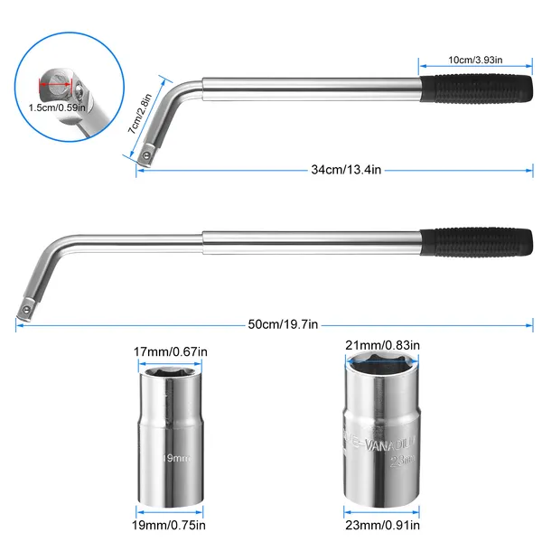 *2 REPLACEABLE STANDARD SOCKETS*:Coming with 2 replaceable sockets(one is 17/19mm; the other is 21/23mm) to tighten or undo the nuts in different sizes conveniently.