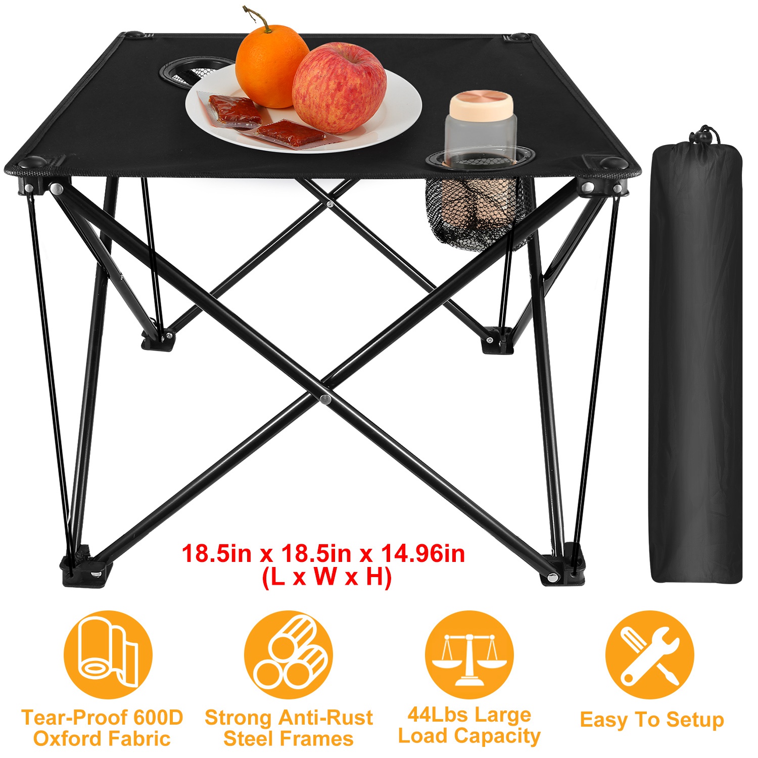 Material: 600D Oxford Fabric (Table Cloth), Steel (Frame), 210D Polyester Fabric (Carry Bag)
